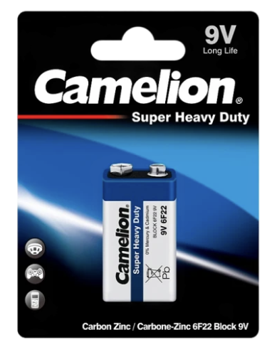 Батарейка Camelion 6F22-BP1B, напряжение 9В, емкость 450мА*ч, кол-во в упаковке 1 шт., размер упаковки 84x114x18 мм, использовать при температуре от -18 до + 55 °C, хранить в сухом помещении