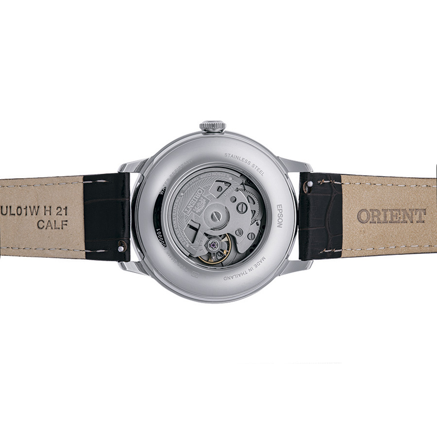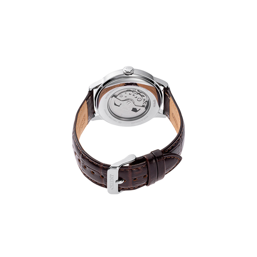 Эти механические часы оснащены автоматическим подзаводом, который также можно дополнить ручным заводом. Они обеспечат до 40 часов работы без подзавода. Часы защищены от брызг (WR 30) и имеют центральные указатели времени (часы, минуты, секунды). На циферблате отображается дата и день недели, а также индикатор день/ночь. Часовые отметки представлены в виде штрихов и цифр. Корпус из нержавеющей стали диаметром 41 мм защищен прочным минеральным стеклом, устойчивым к царапинам. Задняя крышка прозрачная, позволяющая видеть механизм. Завершает образ коричневый кожаный ремешок.