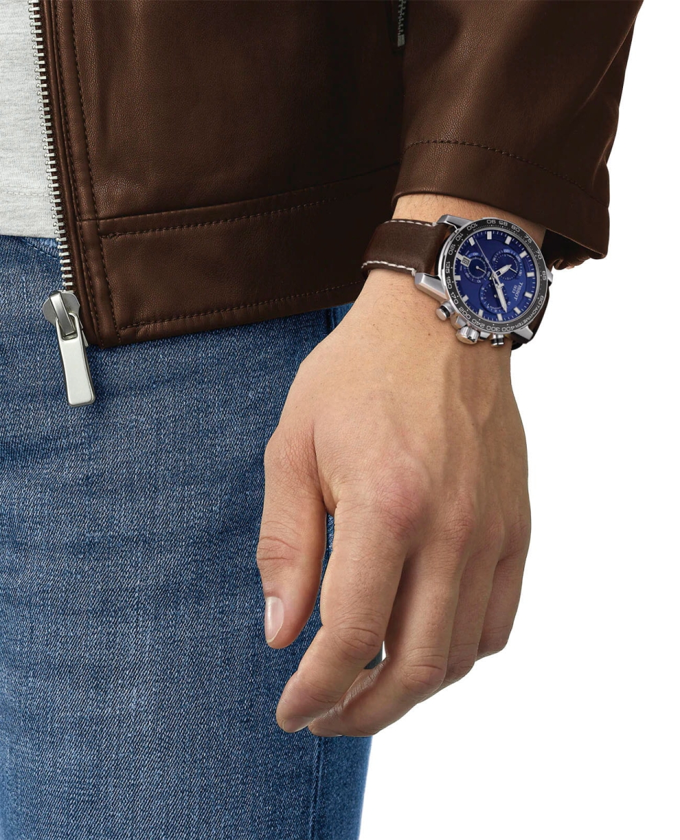 Массивный стальной корпус привлекает брутальными, характерными деталями. Это идеальный вариант для мужчины, желающего всегда быть в центре внимания. Ярко-синий циферблат в окружении чёрного безеля со шкалой тахиметра – беспроигрышное сочетание. Ремешок из натуральной кожи с крупной белой прострочкой является элементом из спортивного мира. Динамичный хронограф измеряет время с абсолютной точностью хода благодаря швейцарскому кварцевому механизму ETA G10.212. Сапфировое стекло устойчиво к царапинам. Стрелки и индексы дополнены люминесцентным покрытием. Среди функций: секундомер, отображение даты. Высокая водонепроницаемость – до 100 метров. Диаметр корпуса: 45,5 мм.